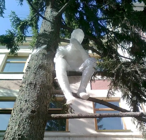 5. Создание объемных моделей Берется какой-нибудь объемный исходник (например, человек), ставится в требуемую позу и обклеивается кусочками скотча толстым слоем. Затем конструкция аккуратно разрезается в минимуме мест, исходник извлекается, а модель заклеивается. Получается кокон из скотча в виде чего угодно)) Применение – в меру фантазии.