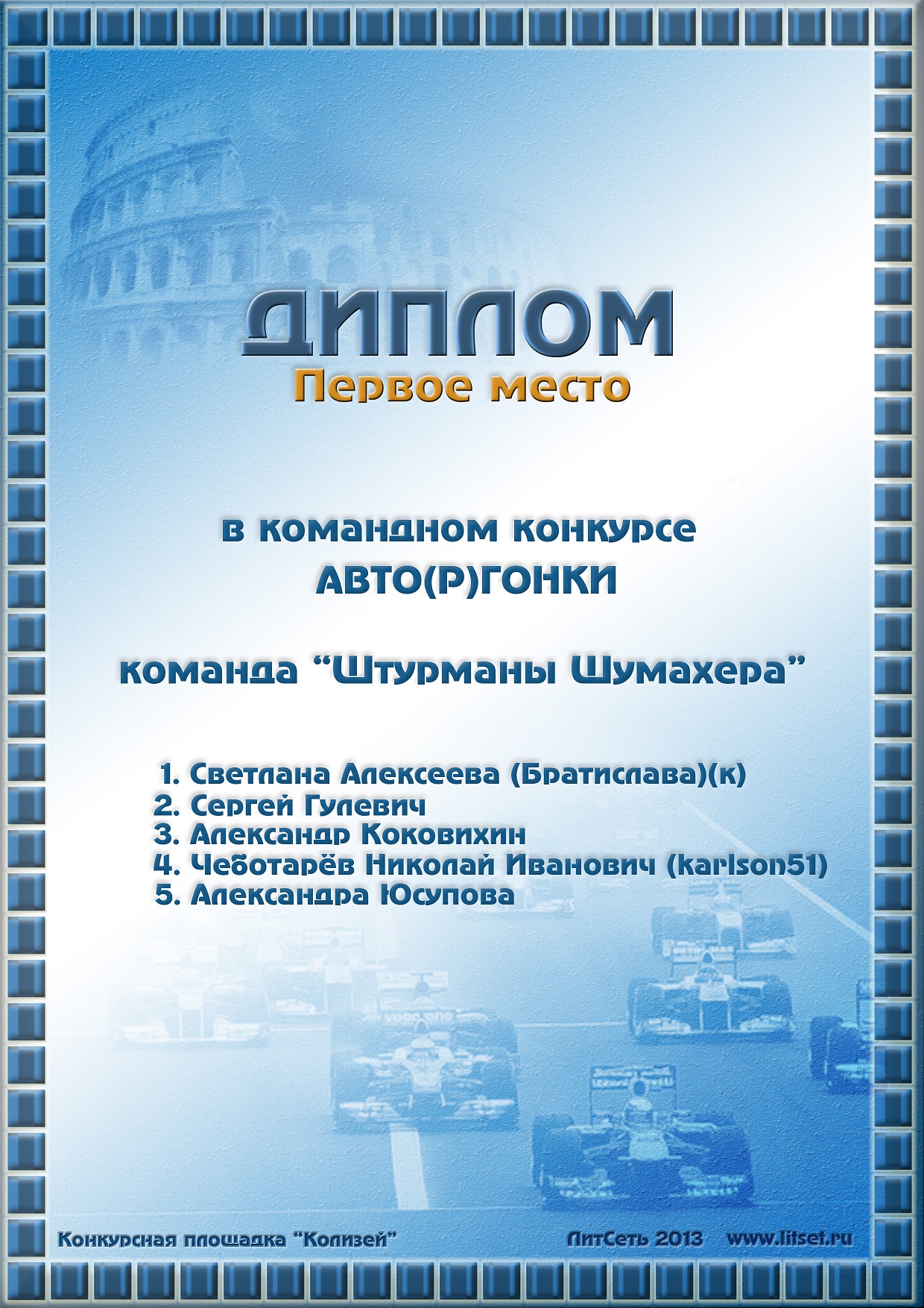 ![]() [Открыть/Сохранить] (94.4 Kb) Код для вставки: [img]http://litset.ru/_ld/24/2467_avtorgonki_dipl.jpg[/img]