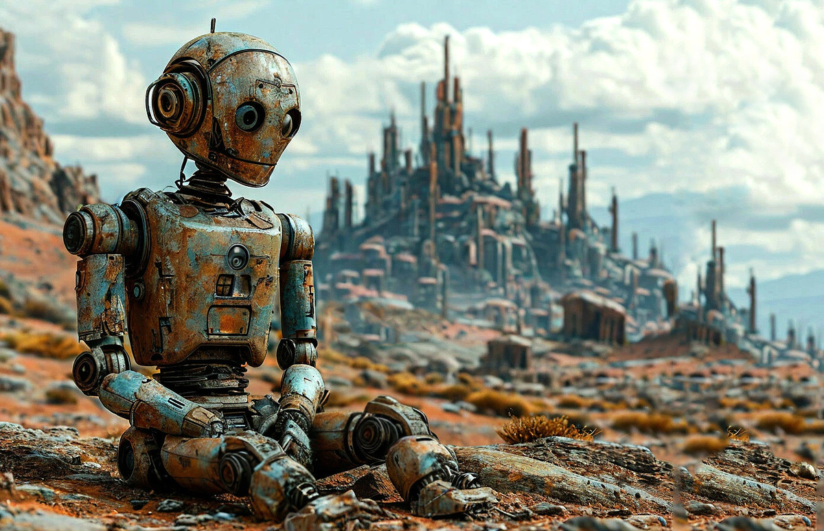 под пристальным солнцем сидел постаревший андроид.